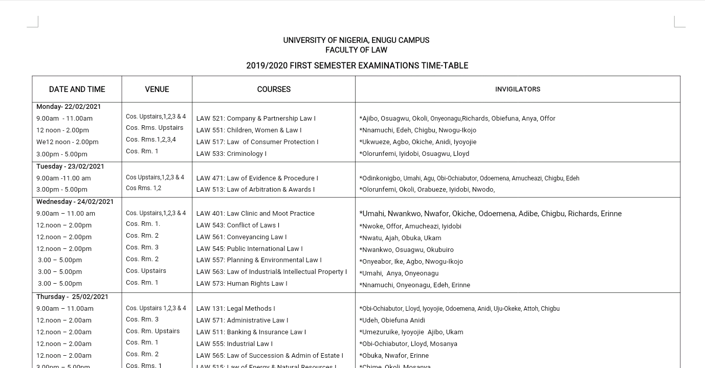 2019/2020 FIRST SEMESTER EXAMINATIONS TIME-TABLE